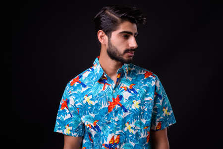Young handsome bearded Persian tourist man ready for vacation against black background