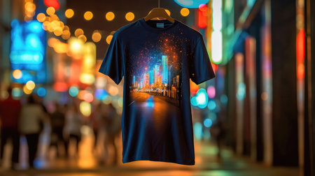 Vibrant T-shirts on street market rack with abstract blurred background.