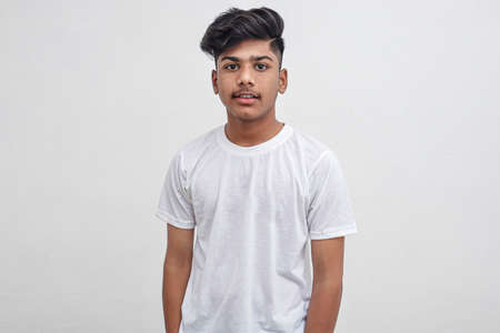 Portrait of cheerful young man smiling while looking at camera holding hands out to sides on white background with space for advertising mock up