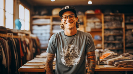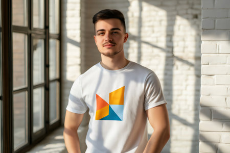 Young man wearing a white t shirt with a colorful geometric logo, standing in a bright, modern office with large windows