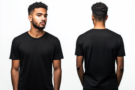 A young man stands confidently in a plain black t-shirt, displaying both front and back views in a well-lit studio environment. The focus is on the shirt's design and fit.