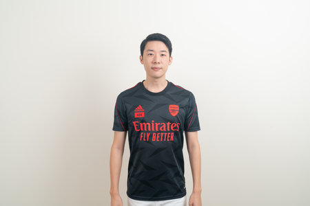 Bangkok, THAILAND - Nov 27, 2021 : Young Asian man wearing Arsenal shirt with white background. Arsenal football club is a famous team in London city.