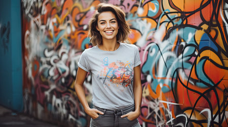 A brunette woman with a gentle smile, wearing a beige t-shirt featuring a graphic print, stands indoors.