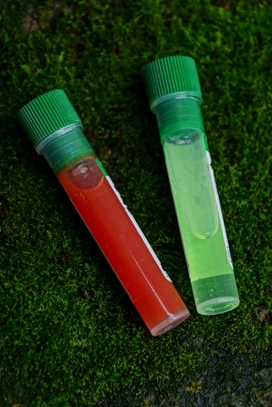 two test tubes with colored liquids on green moss