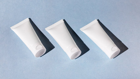 Plastic grey tube for cream or lotion. Skin care or sunscreen cosmetic in top view on blue background. Beauty concept for face and body care