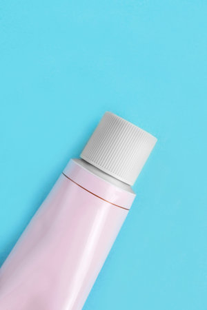 Pink cosmetic product blank tube closeup on blue studio background