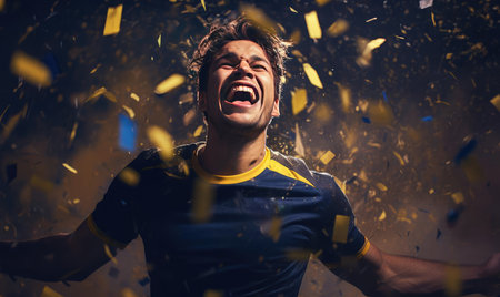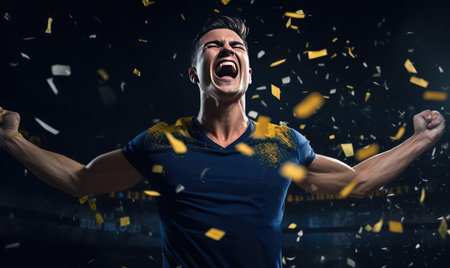 Happy male football sport player celebrating winning with confetti falling, Sports game and celebrating.
