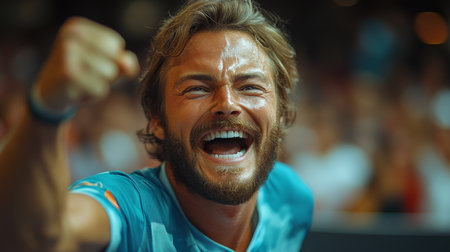 Excited fan celebrates a thrilling moment during a tennis match at a lively stadium filled with enthusiastic spectators. Generative AI