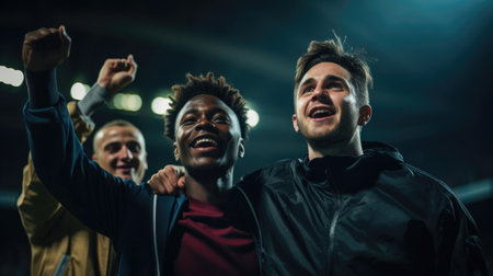 A diverse group of individuals standing together, raising their hands in a show of support and unity, A group of fans cheering and chanting in support of their team