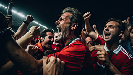 Fan football, Celebrating the success. Supporters cheer in bleacher. Generative Ai