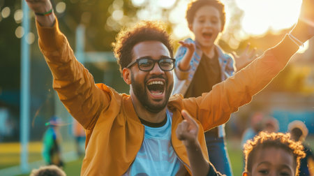 A vibrant image capturing the moment of celebration as a trophy is lifted high amidst a cheering crowd, symbolizing victory and achievement in an outdoor setting.