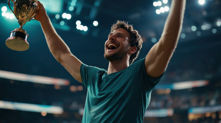 The image captures a triumphant athlete holding a championship trophy high. His expression radiates joy and pride as he celebrates victory. Behind him, ecstatic supporters cheer enthusiastically, creating a vibrant atmosphere. The background features a dynamic splash of colors, enhancing the celebratory mood.