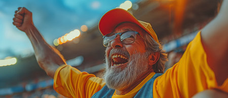 A jubilant soccer fan celebrates a goal, cheering and clapping in a stadium filled with spectators during a crucial match. AIG41