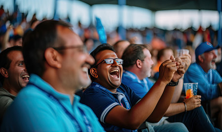A crowd of fans in the stadium joyfully watches the soccer game, entertained by the players gestures, smiling and having fun. AIG41