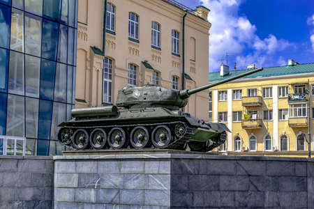 Kharkiv, Ukraine - July 20, 2020: A T-34-85 tank on display at M.F. Sumtsov Kharkiv Historical Museum, outdoors. Soviet medium tank of the World War II against of city buildings on a summer day
