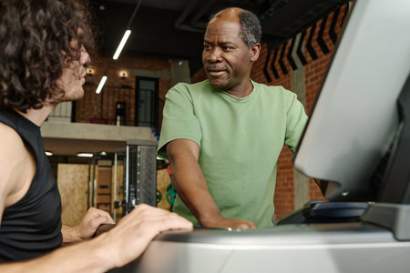 Elderly black man standing on treadmill at gym talking to young caucasian guy standing next to him