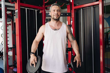 Handsome athletic man takes dumbbells from the racks for further training in the gym.