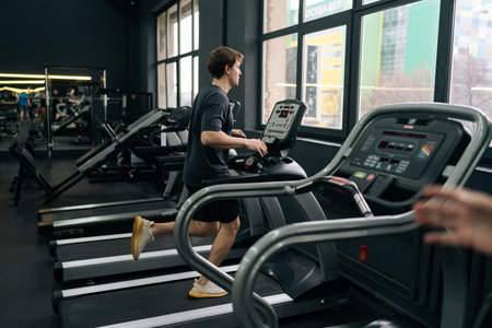 Rear remote view of athletic man jogging on gym machine, having cardio session in well-equipped fitness club. Side view of beginner sportsman having intensive cardio workout to burn calories in gym.