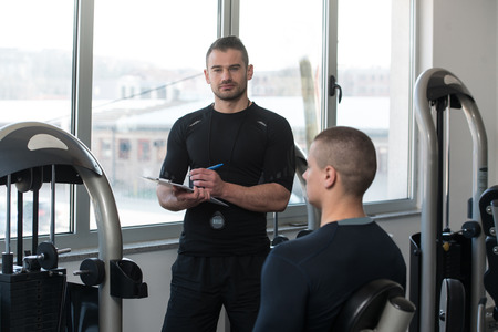 Personal Trainer Takes Notes While Young Man Exercise Legs On Machine In The Gym