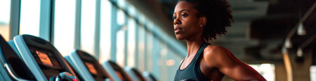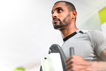 Medium close up of African American man doing cardio, he using elliptical machine