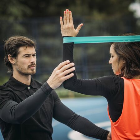Personal fitness trainer coaching young woman, doing resistance band exercises.