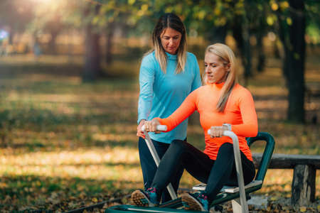 Fitness woman with personal trainer doing exercises on mat outdoors