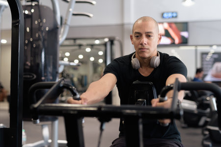 Bald Hispanic man training in gym for fitness and workout. Muscular male exercising indoors with confidence, wearing black shirt and headphones. Healthy lifestyle, strength and wellness focus.