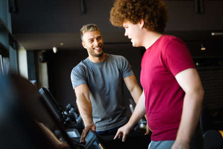 Overweight young man exercising gym with personal trainer