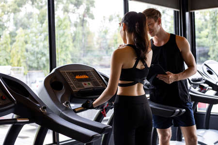 Sexy woman on treadmill with handsome trainer taking care in the gym.