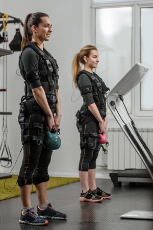 EMS training. Ecstatic girl performs exercises in a suit with cables.