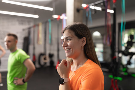 Portrait of a female trainee smiling while resting at the gym