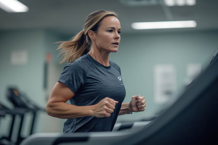 Beautiful caucasian blonde woman exercises on a treadmill in her living room