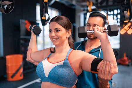 Woman doing exercises. Trainer helping positive woman doing exercises for arms in fitness center