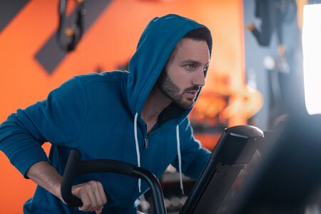 Man feeling thoughtful. Dark-haired athletic man feeling thoughtful and motivated while cycling in gym