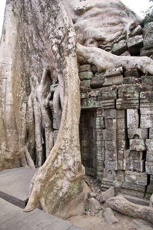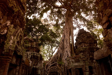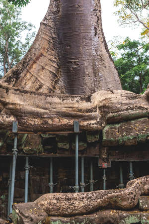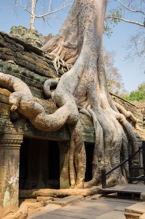 Tetrameles tree (Spung tree) growing in the ruins of the Khmer temple of Ta Prohm in Angkor Wat, Cambodia.