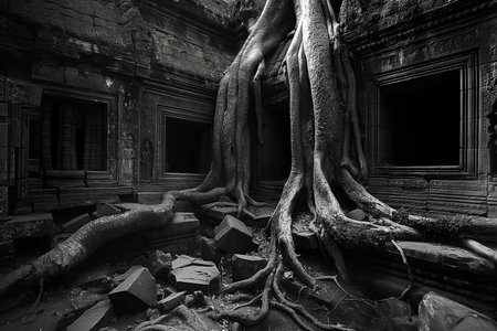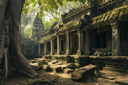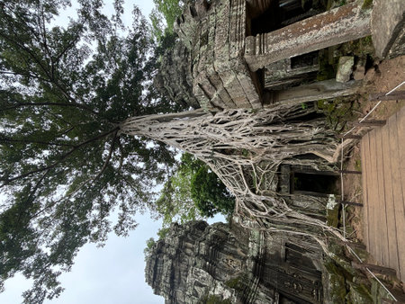 Generative AI : Low angle of wonderful scenery of aged Buddhist temple covered with huge tree roots and located in jungles in Cambodia