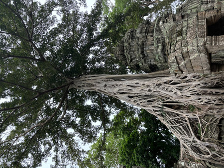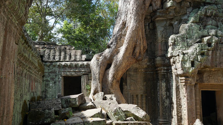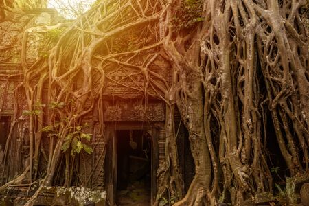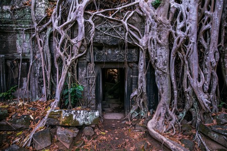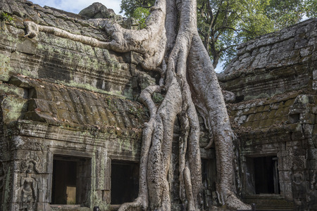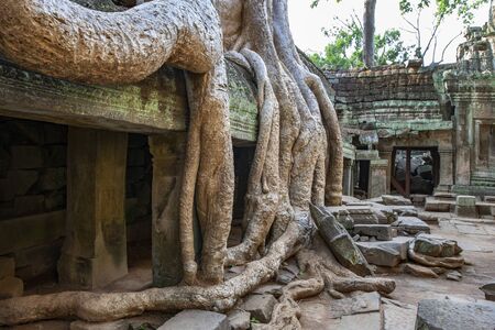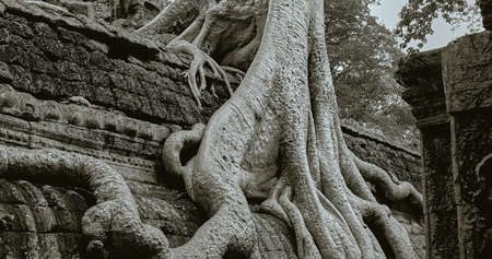 Tree roots growing through the ruins of Ta Prohm Temple at Angkor Wat in Cambodia