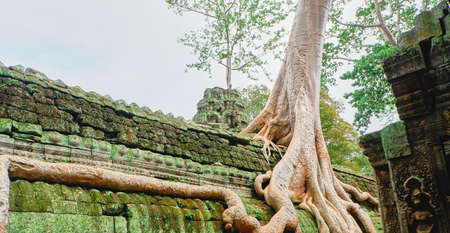 The powerful roots of a giant spung tree snake over the ancient stone walls of Ta Prohm temple in Angkor, Cambodia.