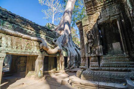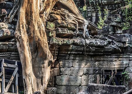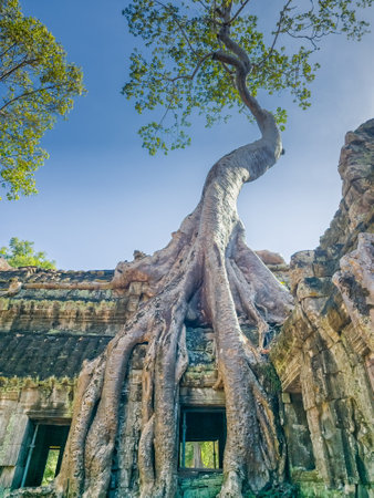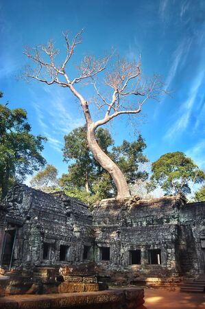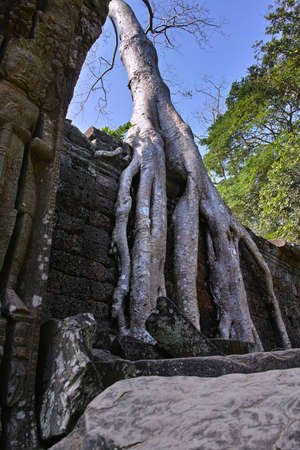 A tall tree entwined with thick giant roots the ruins of an ancient temple. Traces of carving are visible on the stones. Branches and trunk against the blue sky. Angkor, Ta prohm. Cambodia