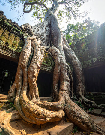 tree roots cover a historic Khmer temple in Angkor Wat, Cambodia.