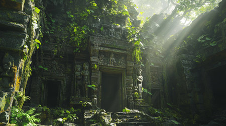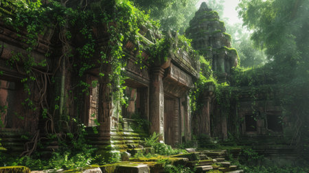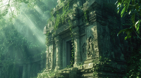 An ancient, abandoned temple overrun by nature, with intricate carvings and overgrown vines. Resplendent.