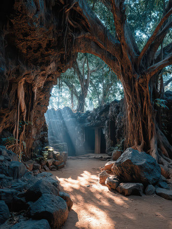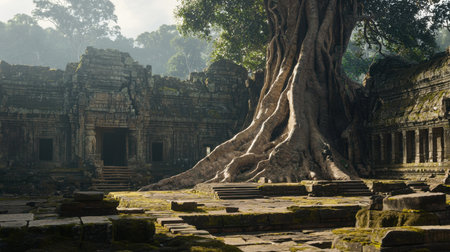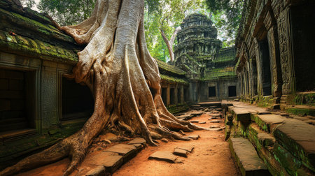 Explore the stunning beauty of ancient temple ruins entwined with massive tree roots, set in a lush, tranquil environment perfect for exploration and photography.