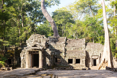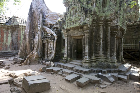Ta Prohm temple with spung tree roots growing in ruins of Angkor Thom