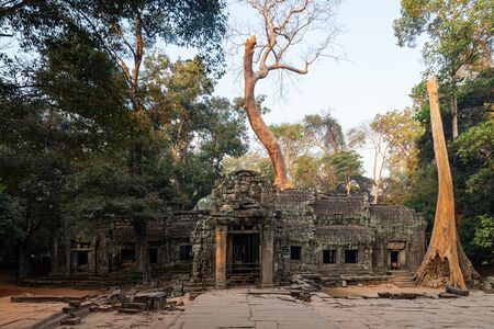 Tower, huge trees and galleries at sunny morning in Ta Prohm Temple, Siem Reap, Cambodia.
