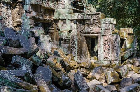 Broken ruined stone at ancient temple entrance