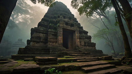 An ancient ruin on a misty mountain, with forgotten temples and overgrown paths. A mysterious fog envelops the scene, creating a sense of mystery and age. Resplendent.