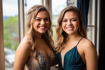 two girls smiling at the camera while wearing formal prom dresses, created with generative ai