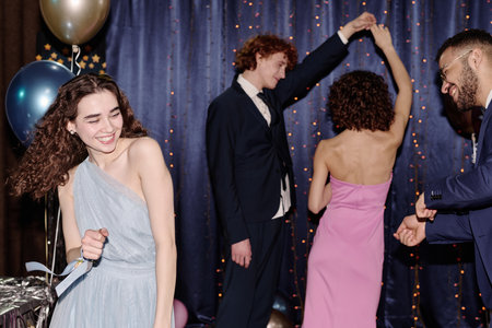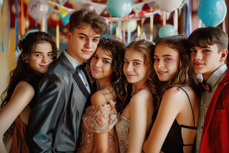 Group of teenagers dancing at party, smiling Caucasian girl in foreground enjoying music, multiethnic teenagers in formal attire celebrating together with balloons and festive backdrop