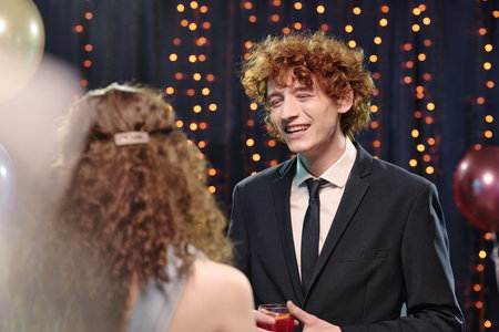 Teenage Caucasian boy in suit smiling and talking to teenage Caucasian girl at party, holding drink in hand, standing in front of festive backdrop with balloons and string lights