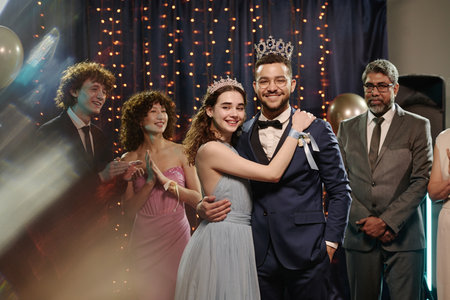 Caucasian teenage girl and teenage boy wearing crowns embracing and smiling at camera during prom celebration